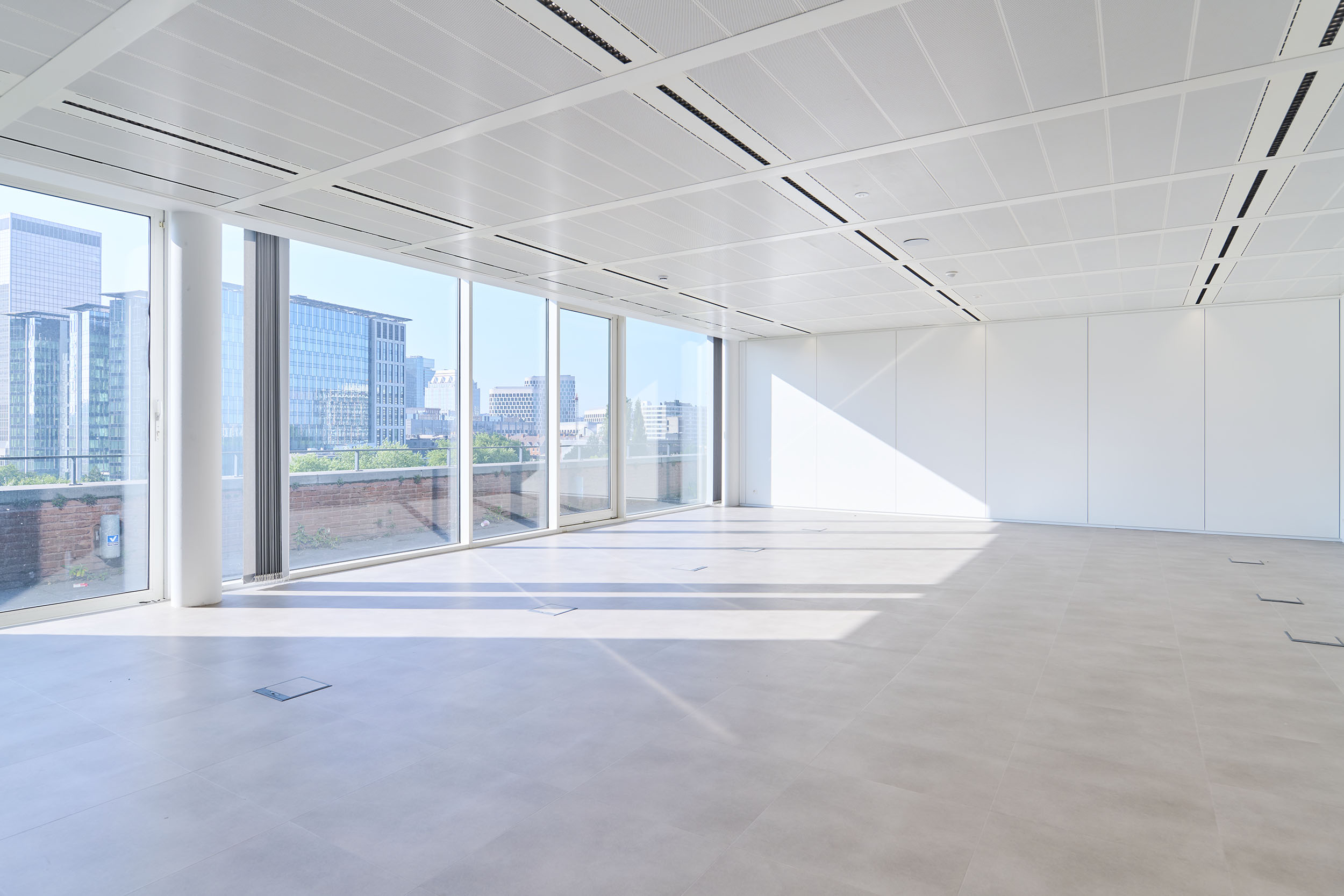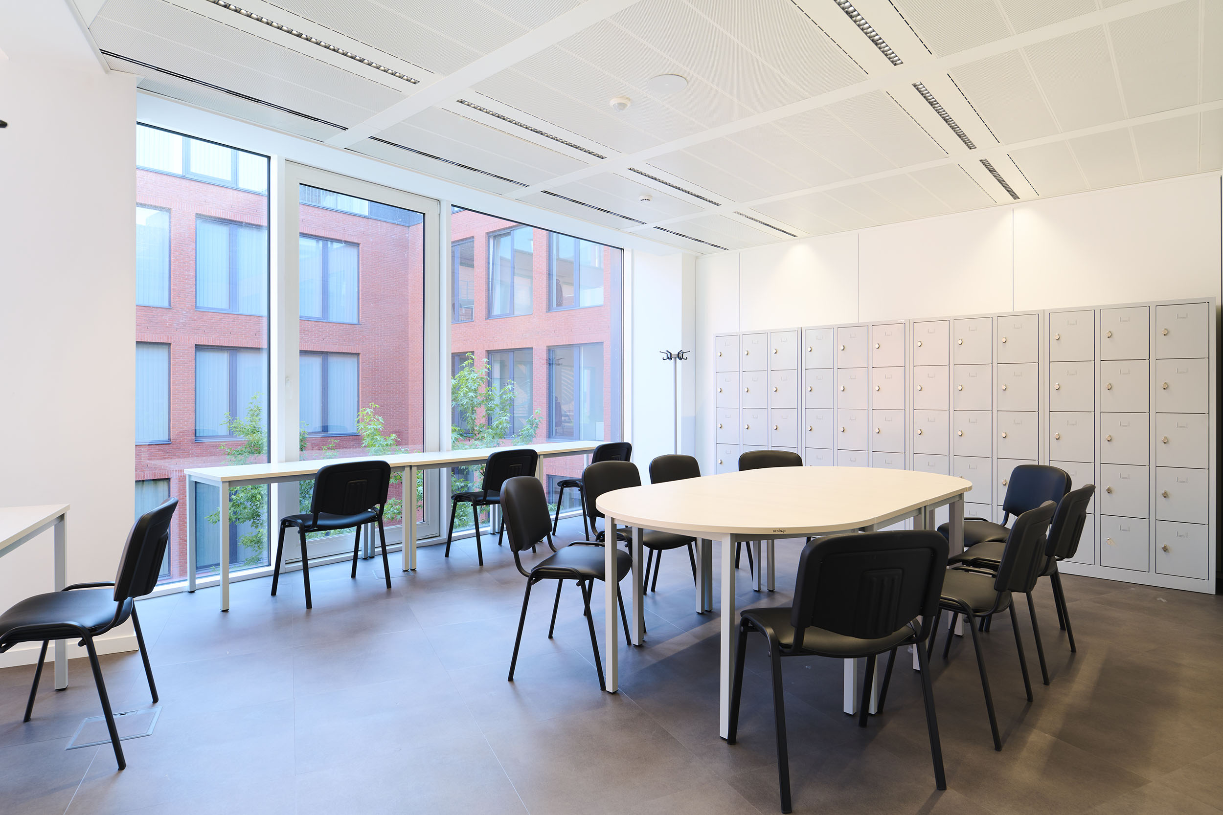 Une attention particulière a été portée au réemploi et à la durabilité : 100 % des cloisons modulaires et des boîtes de sol ont été réutilisées, 99 % des faux-planchers et faux-plafonds réemployés, tandis que les blocs de béton Carbstone, neutres en CO₂, ont été privilégiés.
