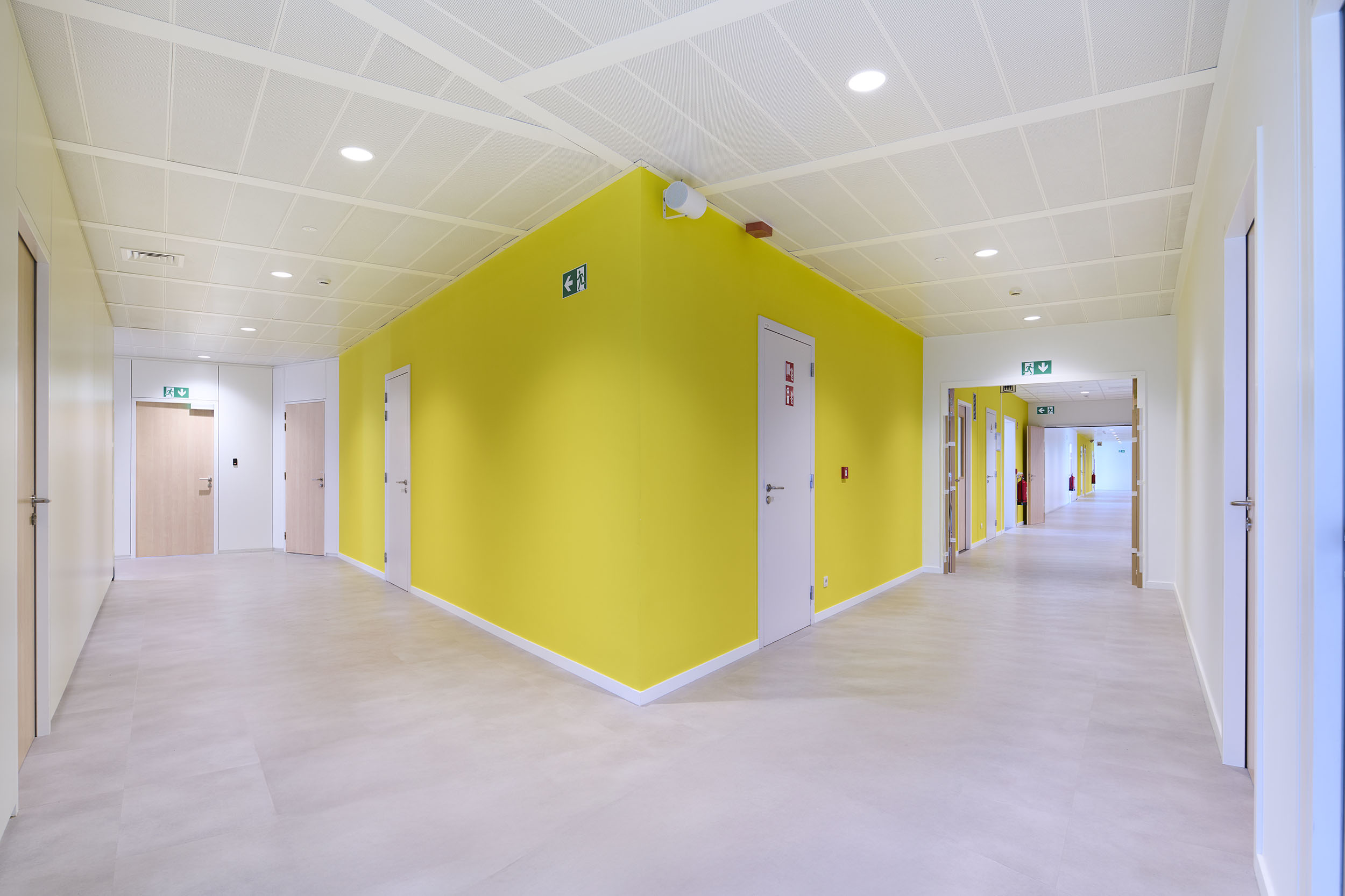 Réalisé en seulement 8 mois, ce chantier a nécessité la dépose, l’évacuation et la sélection de nombreux matériaux, la refonte complète des techniques spéciales, ainsi que la mise en place d’espaces adaptés aux besoins d’une haute école : auditoires, classes, ateliers…